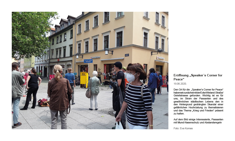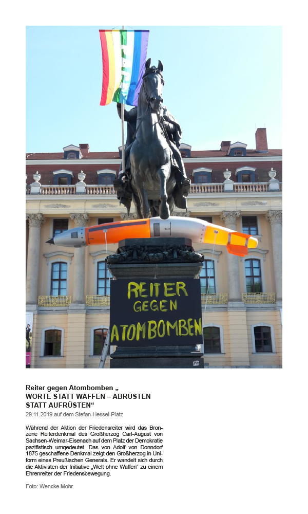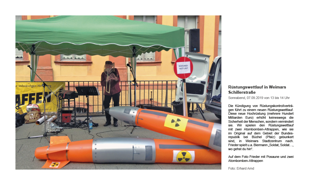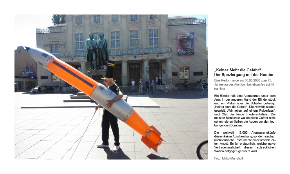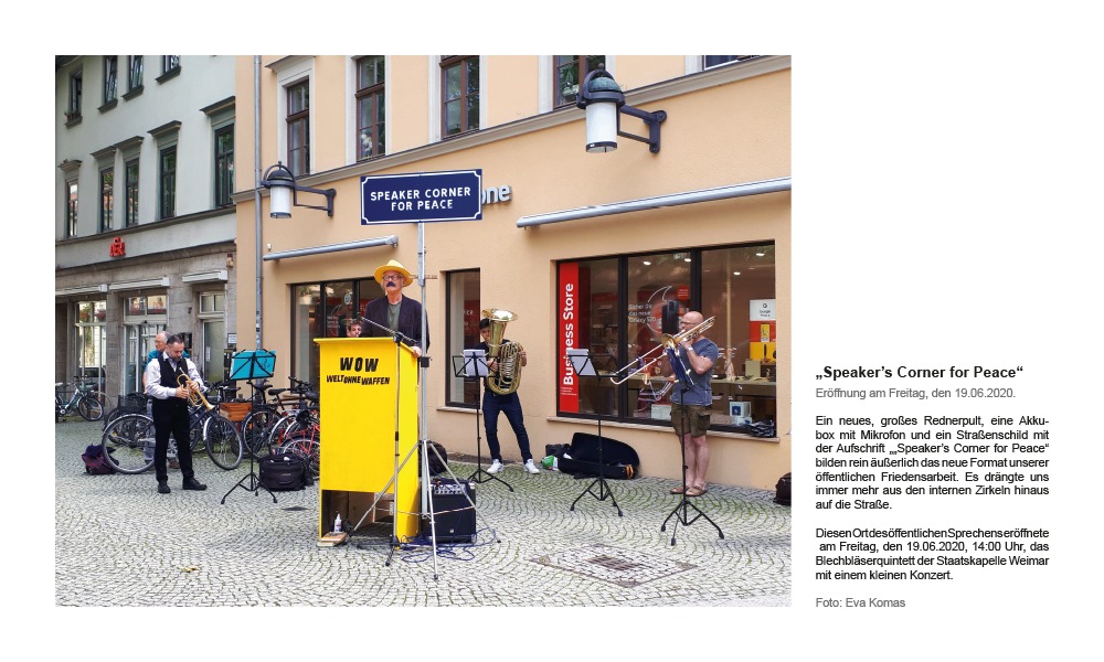 in der ausstellung wird zurückgeblickt auf bisherige aktionen der in weimar gegründeten initiative, u.a. mit fotografien und atombombenattrappe. wer sich beteiligen möchte, hat zudem die chance, sich selbst in der speakers‘ corner for peace zu äußern: das rednerpult wird zur vernissage auf dem stéphane-hessel-platz, danach bis zum 27. september im ausstellungsraum von Blueprint. edition aufgestellt.
