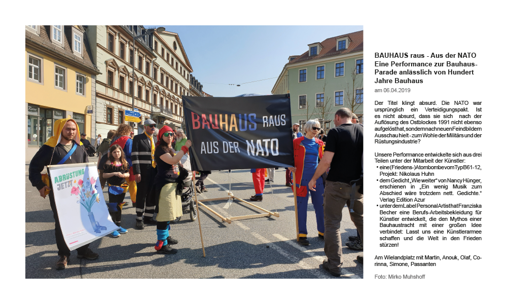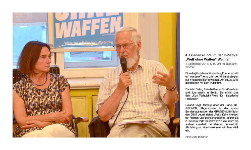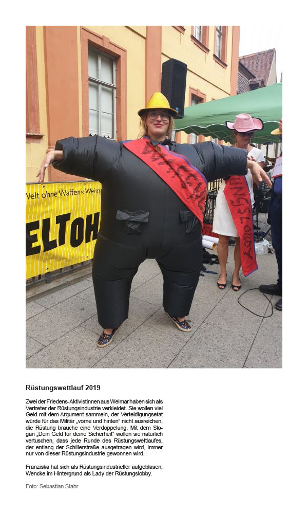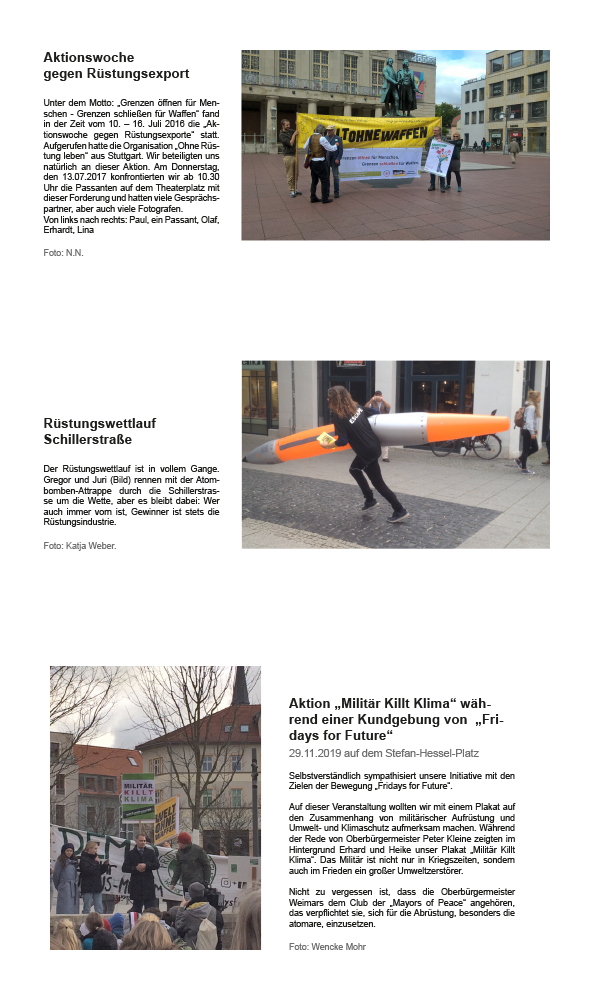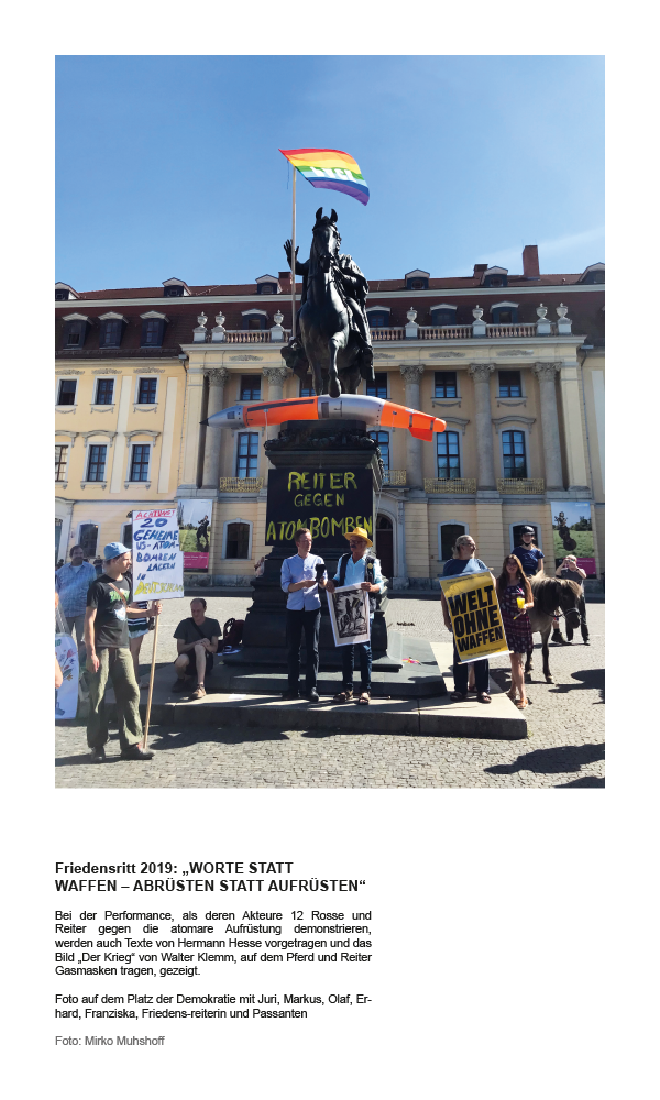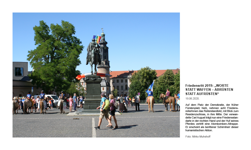 in der ausstellung wird zurückgeblickt auf bisherige aktionen der in weimar gegründeten initiative, u.a. mit fotografien und atombombenattrappe. wer sich beteiligen möchte, hat zudem die chance, sich selbst in der speakers‘ corner for peace zu äußern: das rednerpult wird zur vernissage auf dem stéphane-hessel-platz, danach bis zum 27. september im ausstellungsraum von Blueprint. edition aufgestellt.